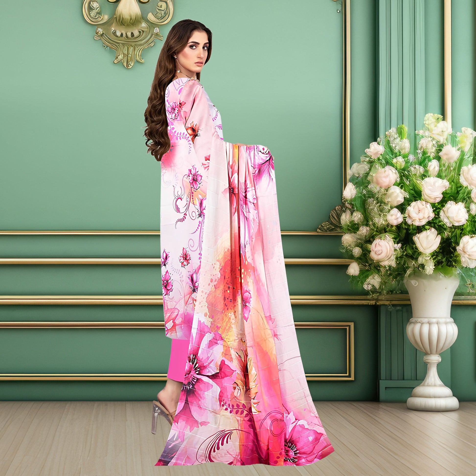 Elegant Pink Floral 3-Piece Digital Printed Lawn & Chiffon Suit